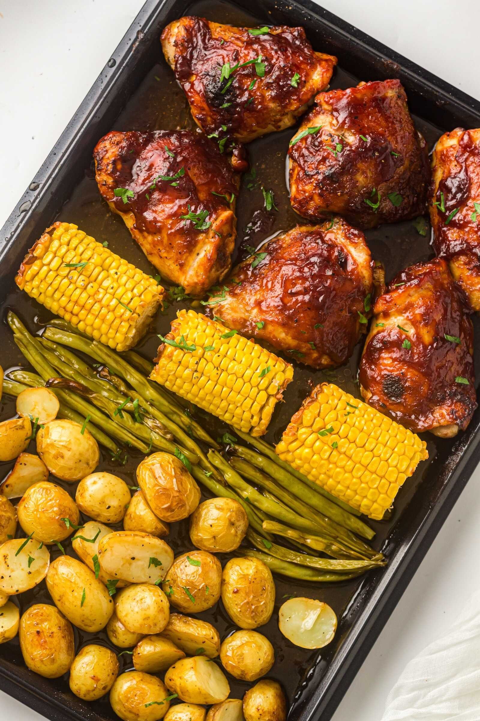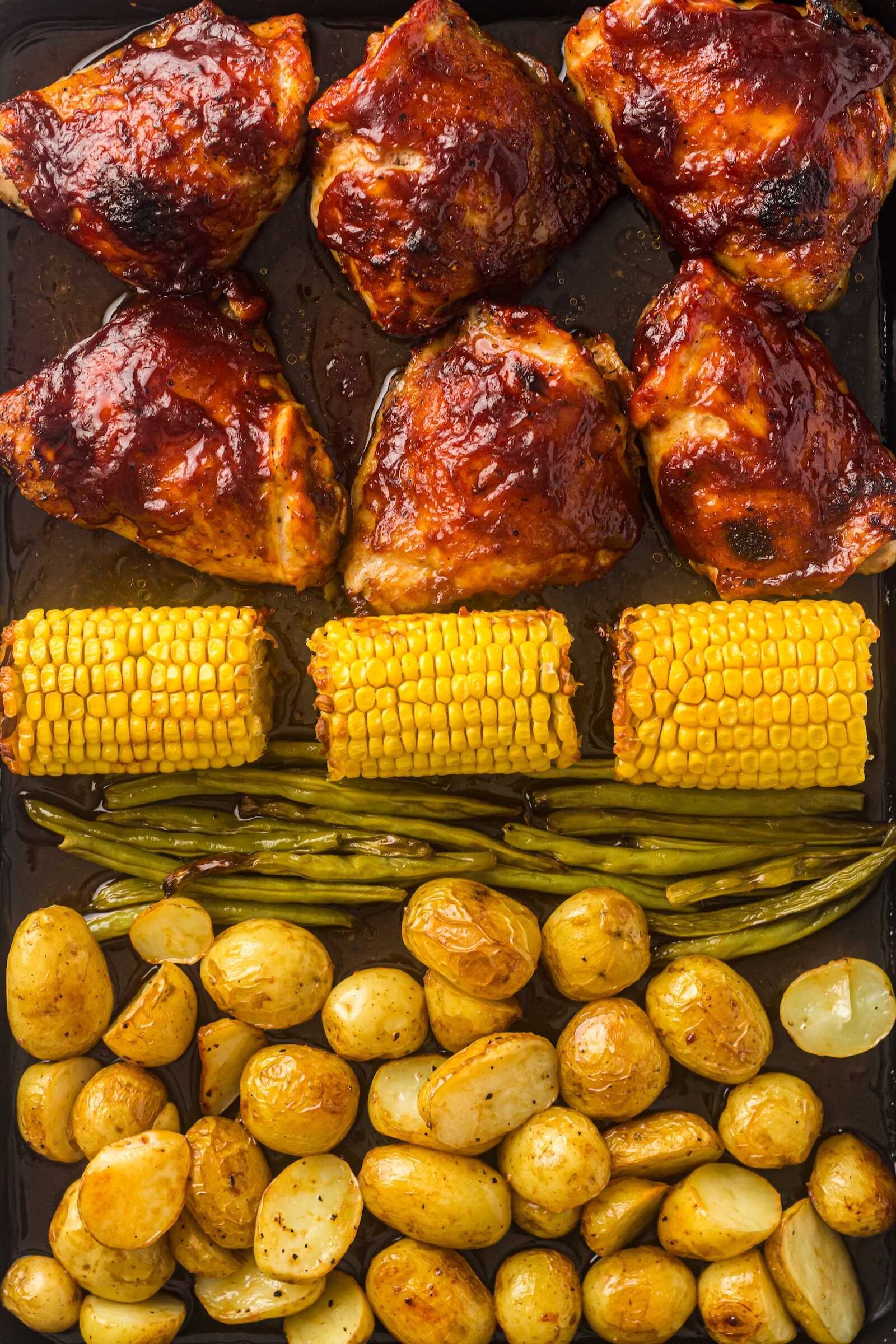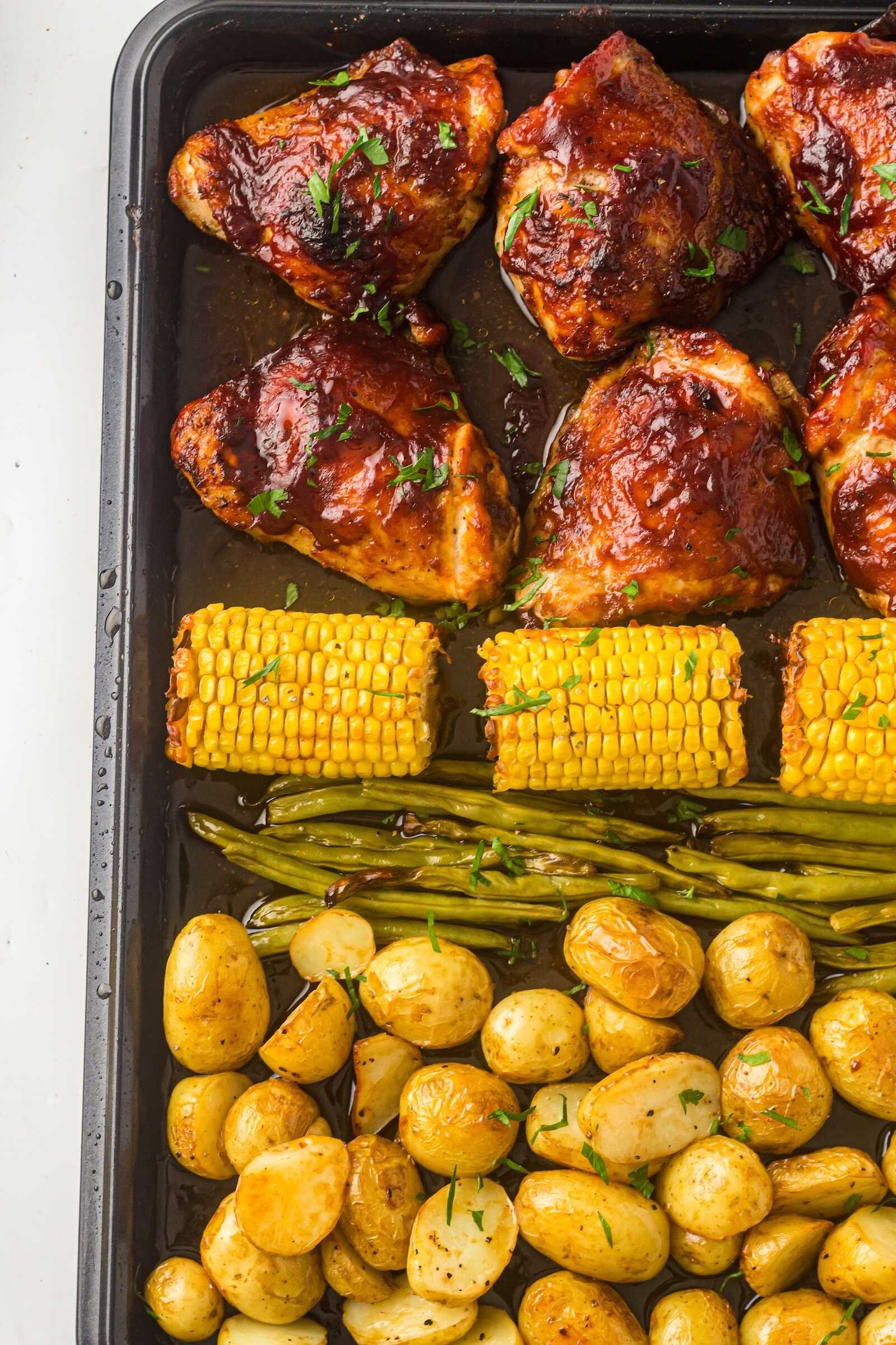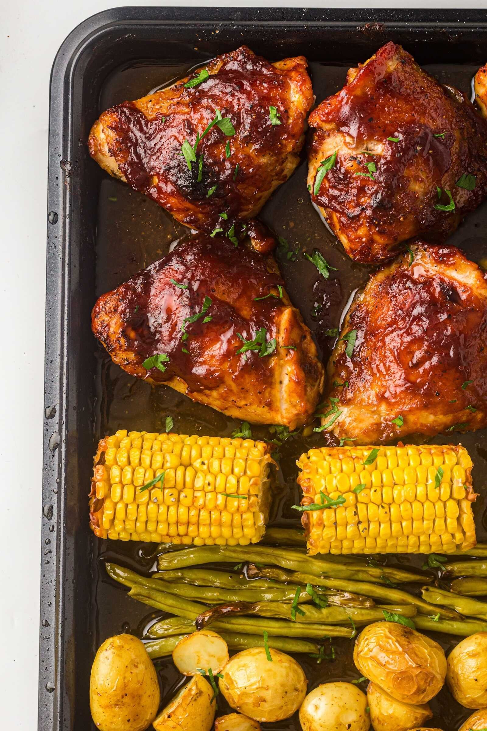Sheet Pan BBQ Chicken Thighs with Baby Potatoes, Green Beans & Corn