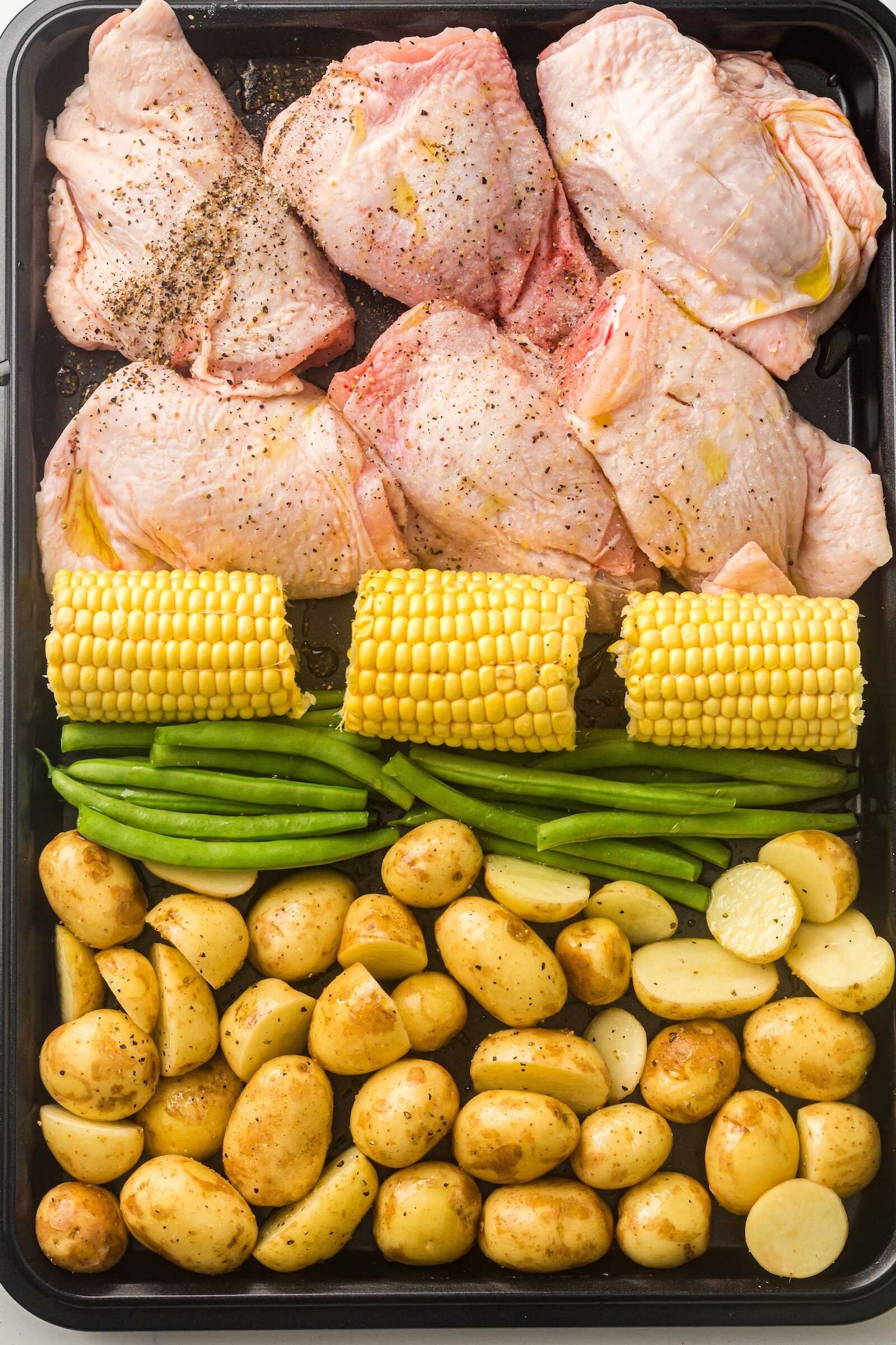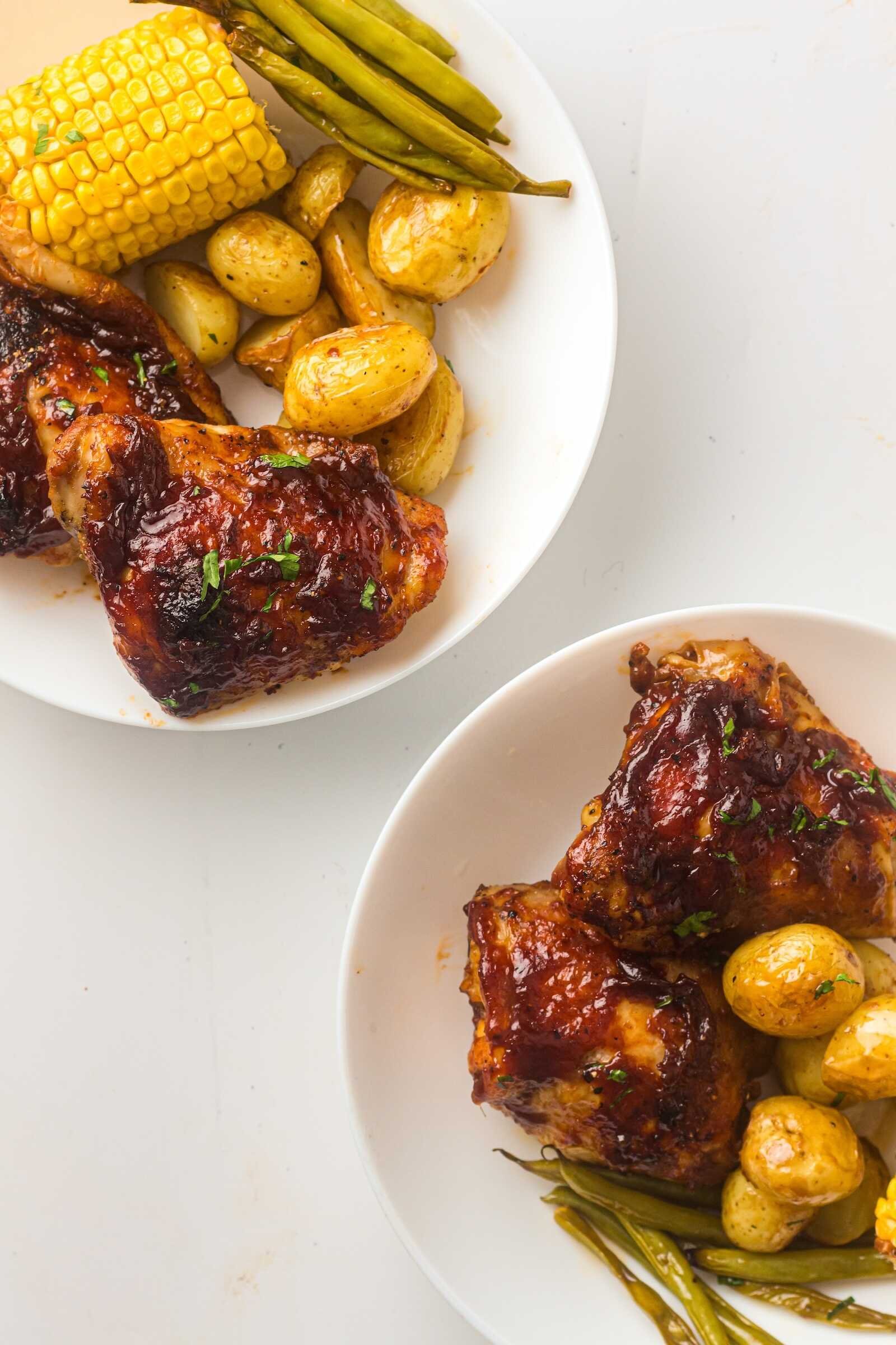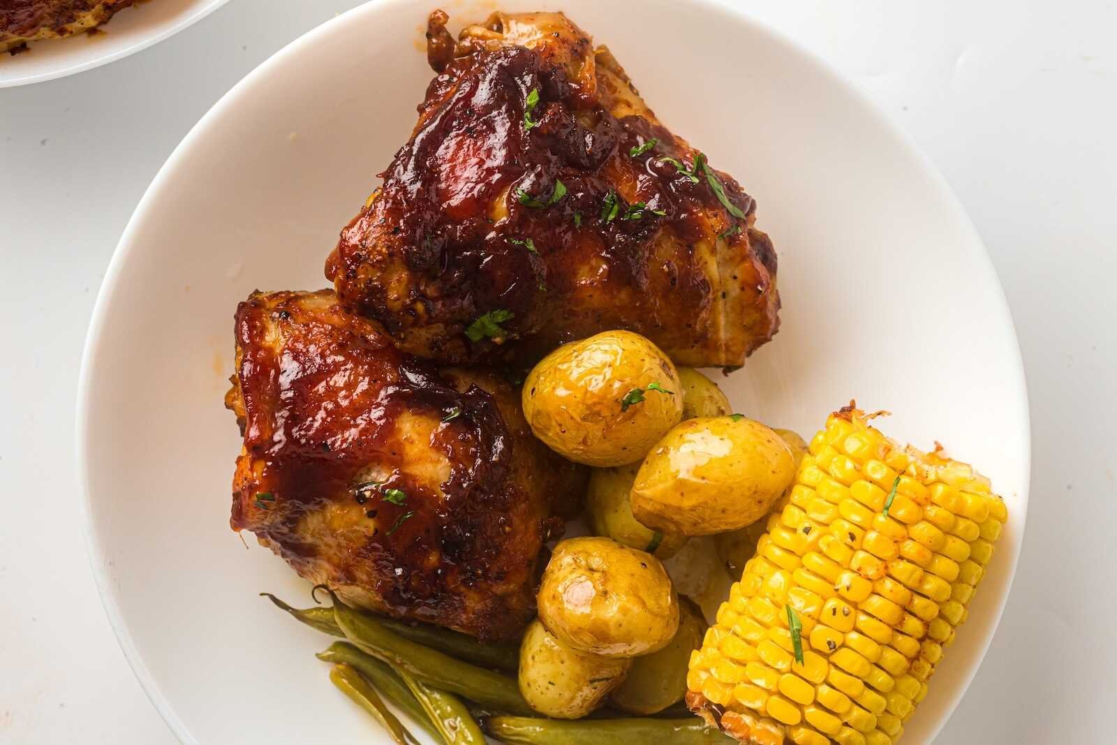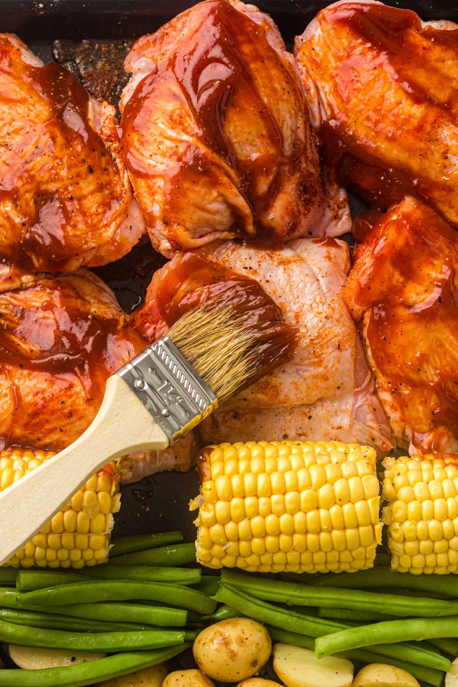 Sheet Pan BBQ Chicken Thighs with Baby Potatoes, Green Beans & Corn