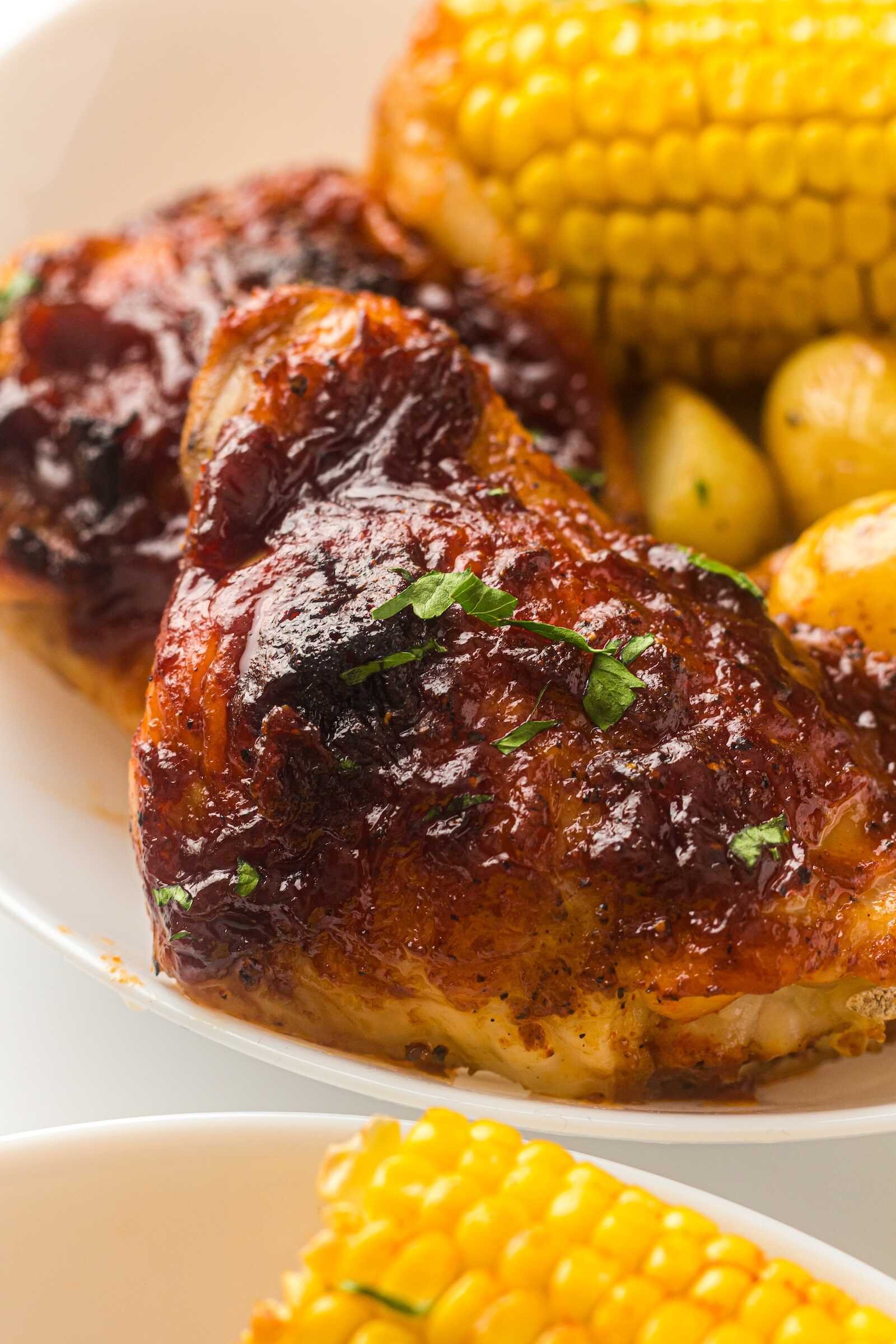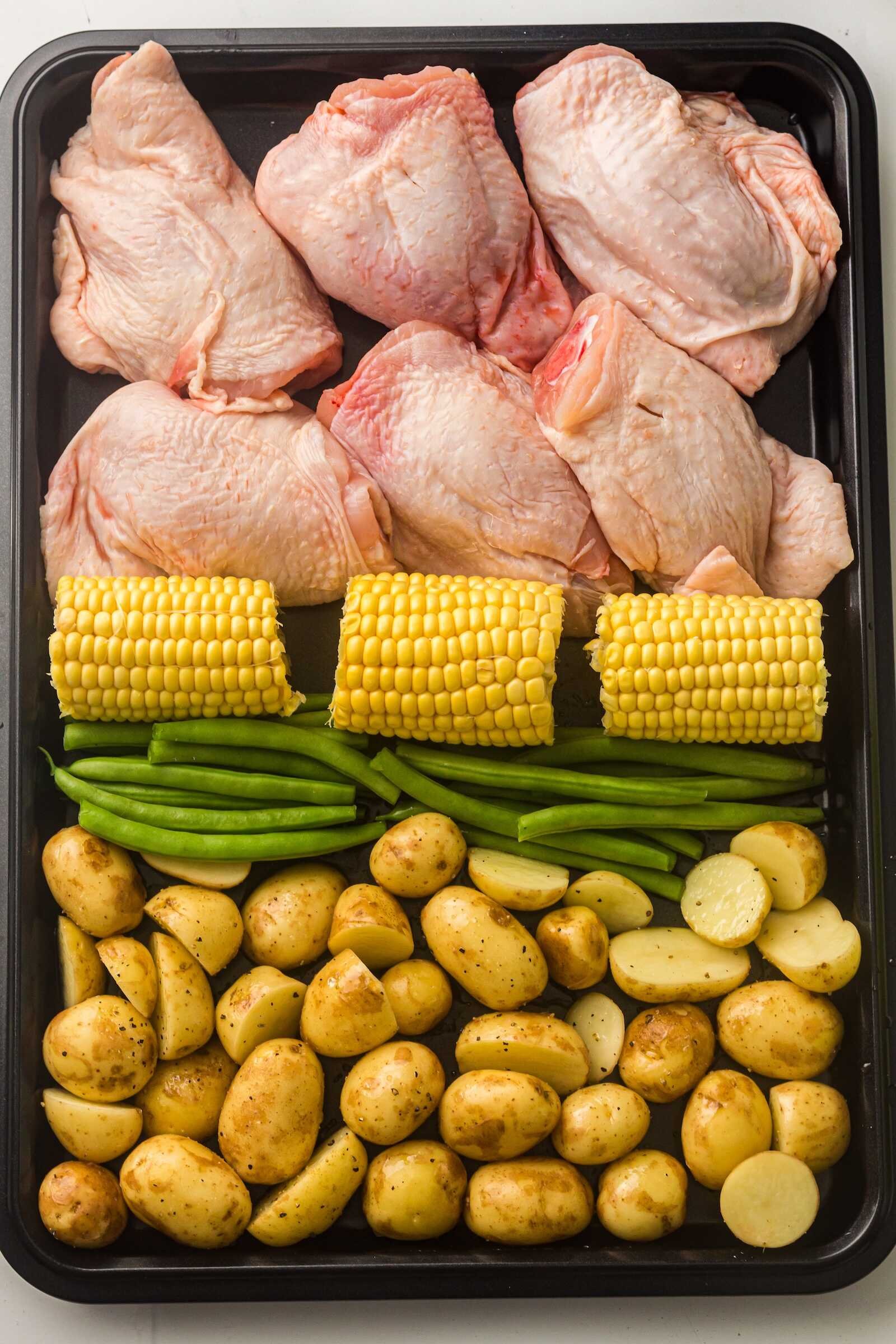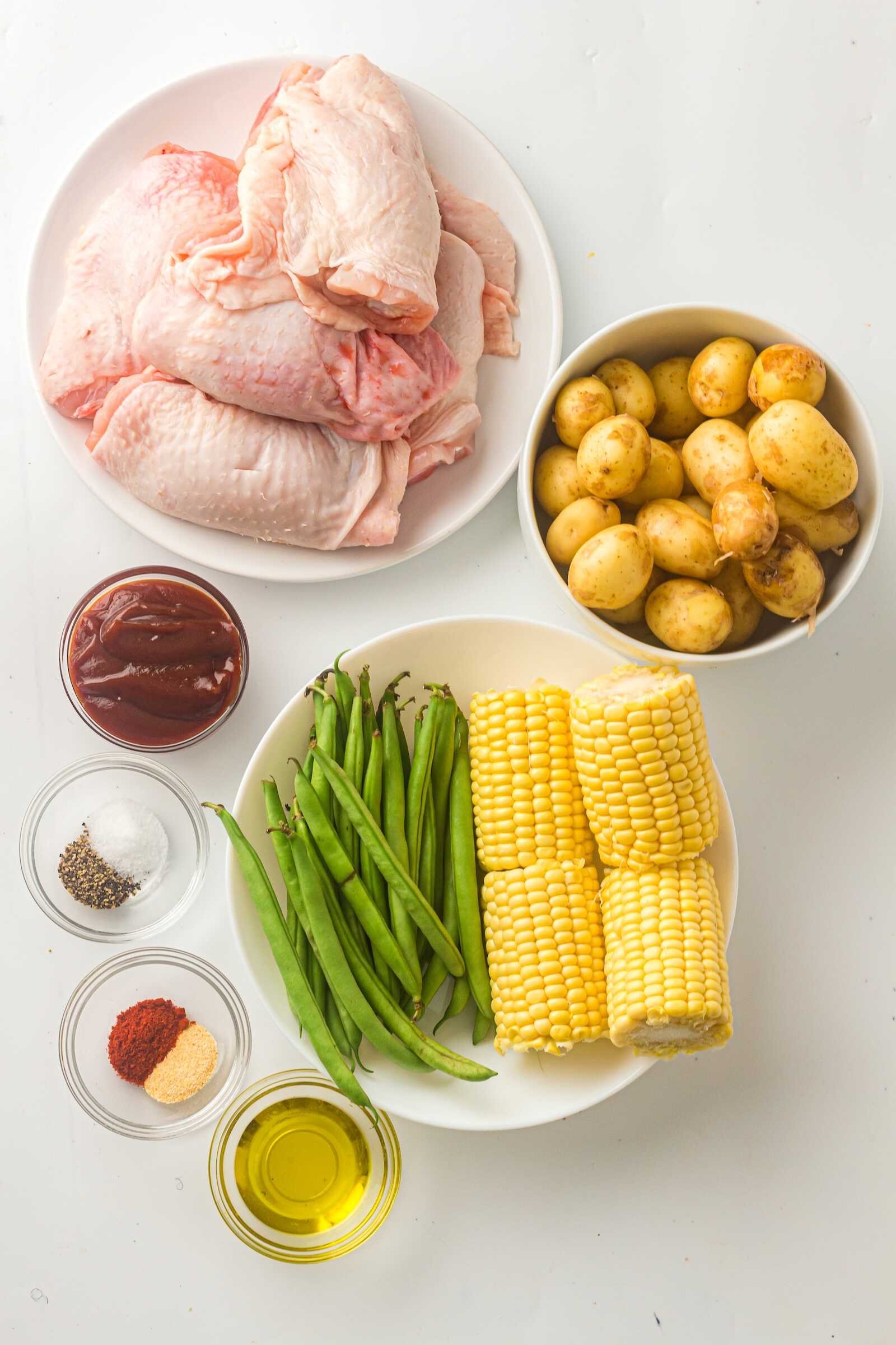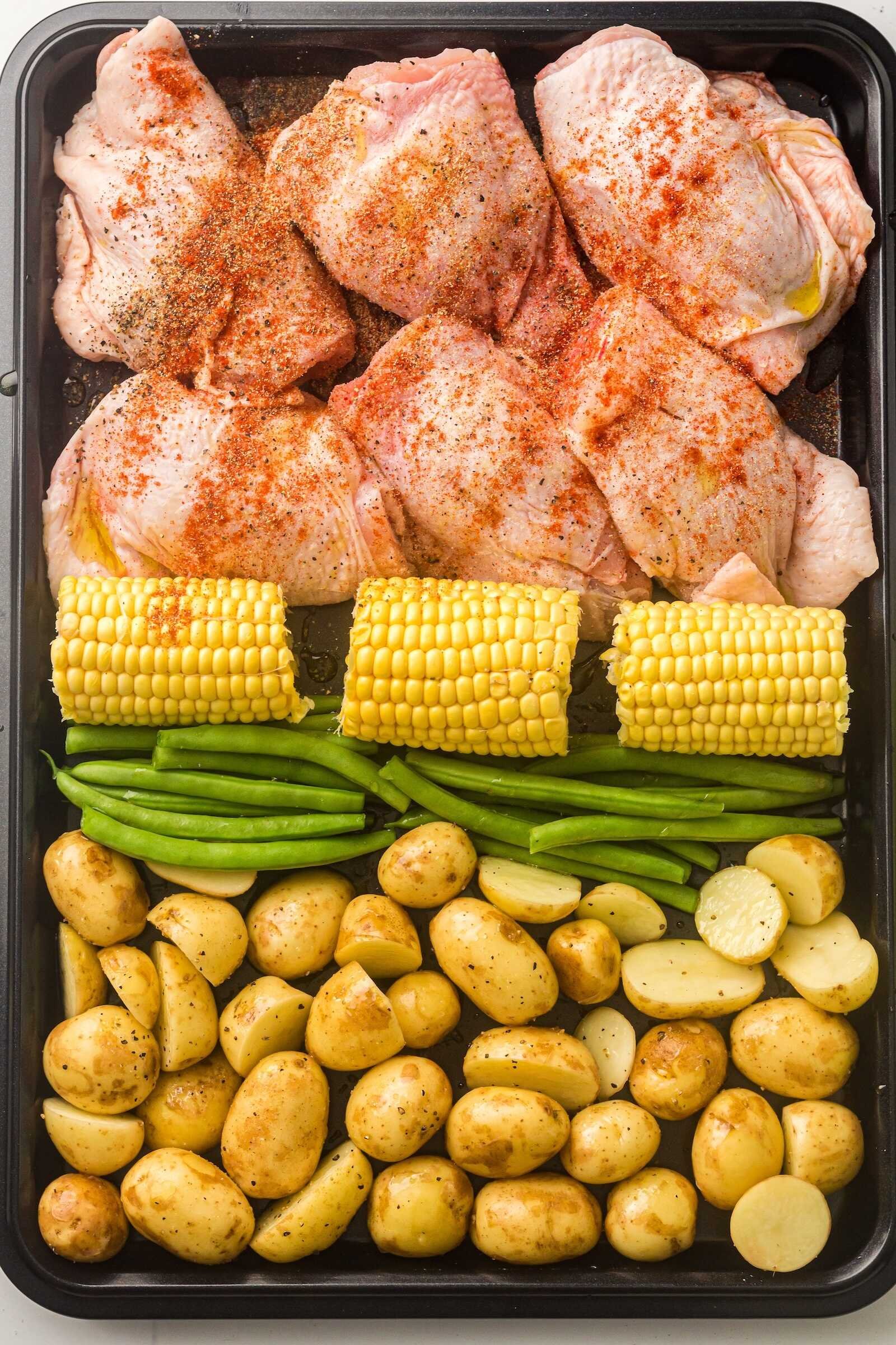 Sheet Pan BBQ Chicken Thighs with Baby Potatoes, Green Beans & Corn