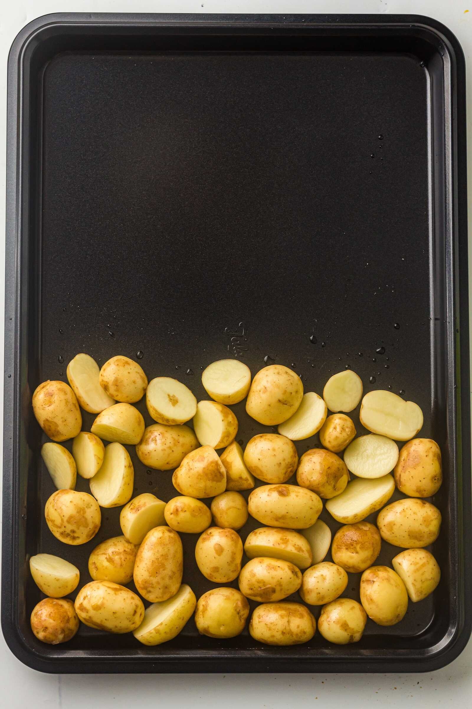 Place the halved baby potatoes on one-third of the sheet pan.