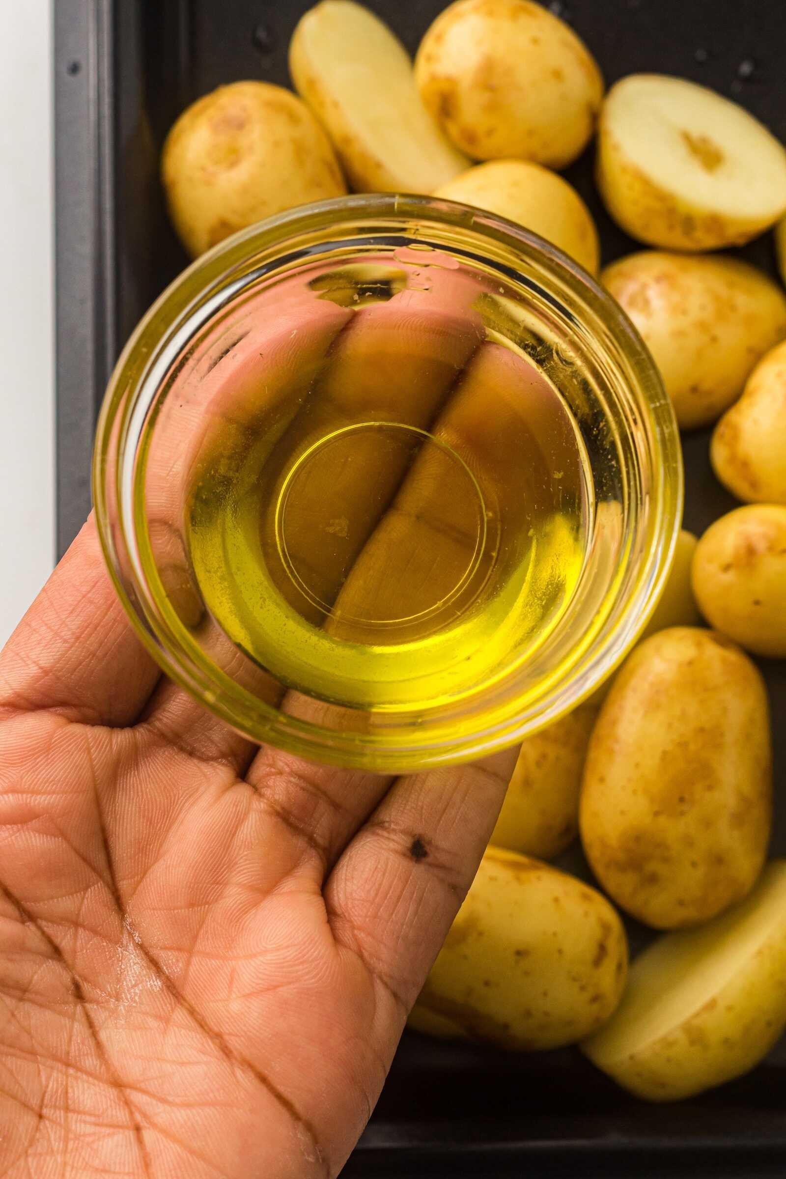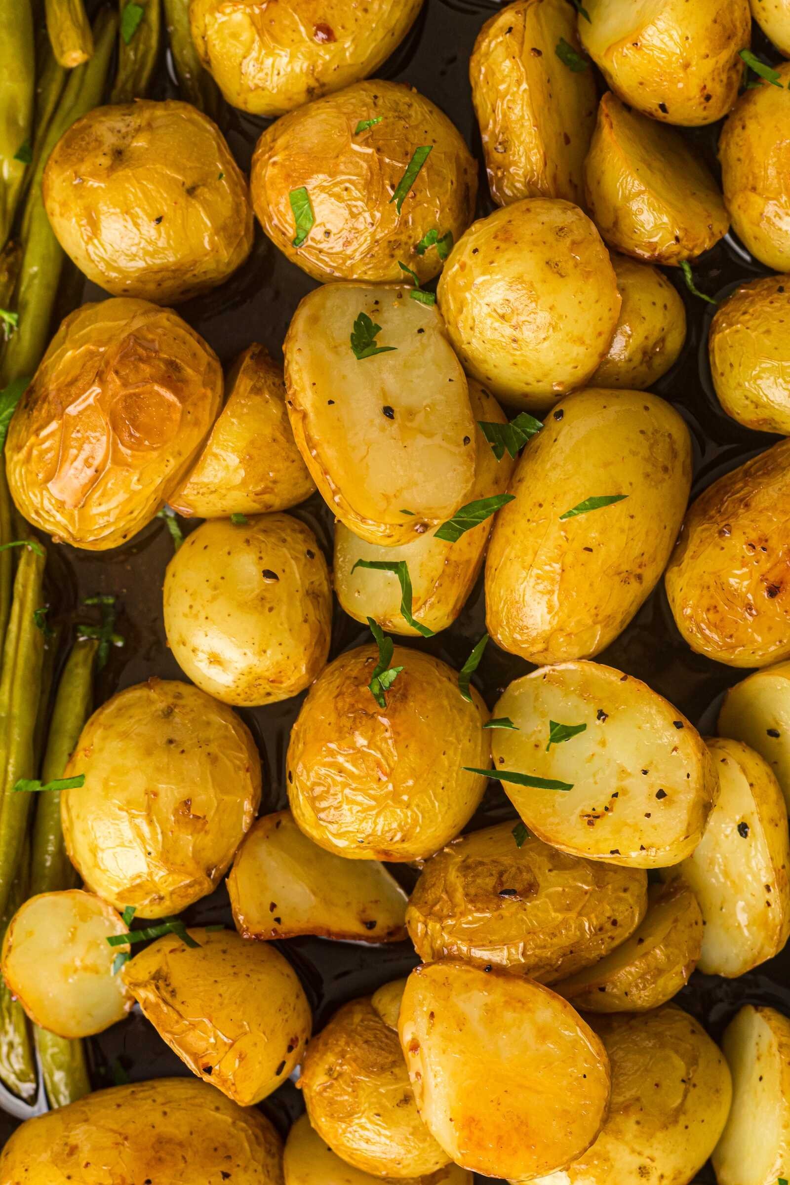 Halve larger baby potatoes so they cook at the same rate. Smaller pieces roast faster and get crispier.